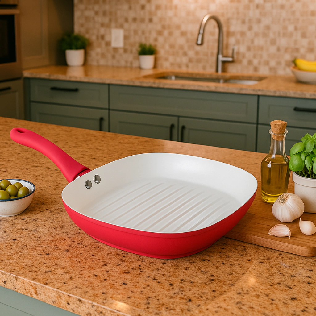 La bifera acanalada de cerámica Carol de 26 cm es ideal para cocinar carnes, vegetales y todo tipo de preparaciones, logrando un dorado parejo y lleno de sabor.