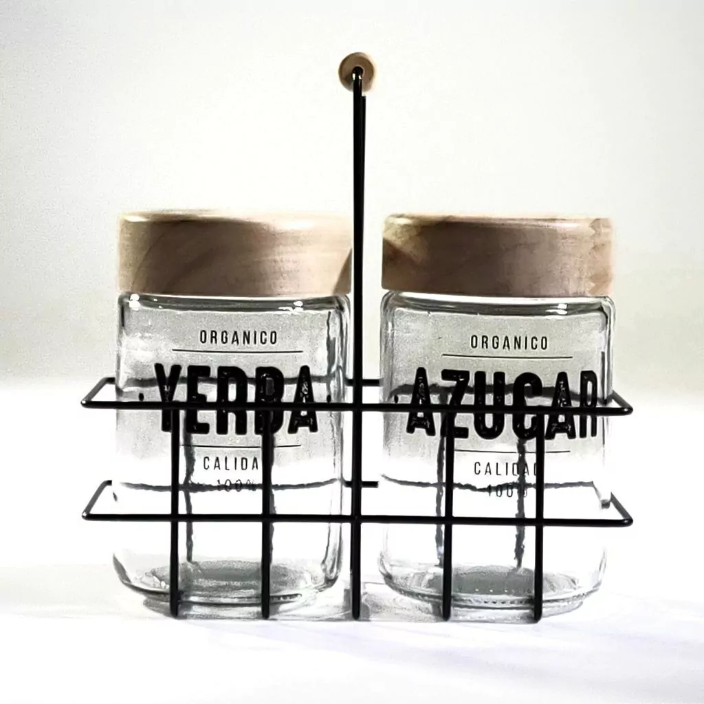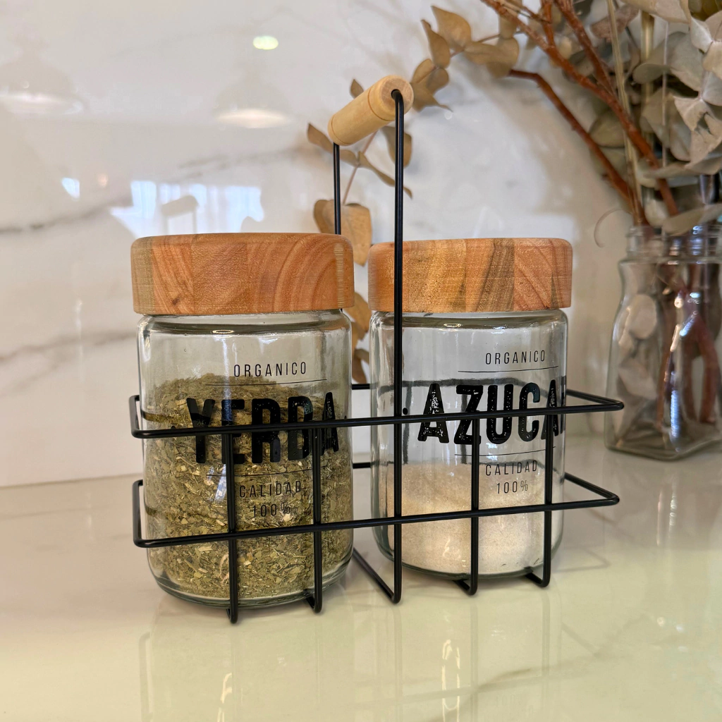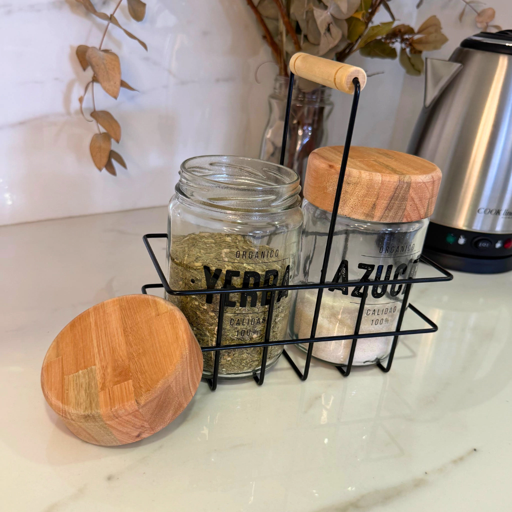 La canasta incluye dos frascos de vidrio de 660 cm cúbicos: uno para la yerba y otro para el azúcar. Además, la tapa de madera le da un toque de estilo y calidez.