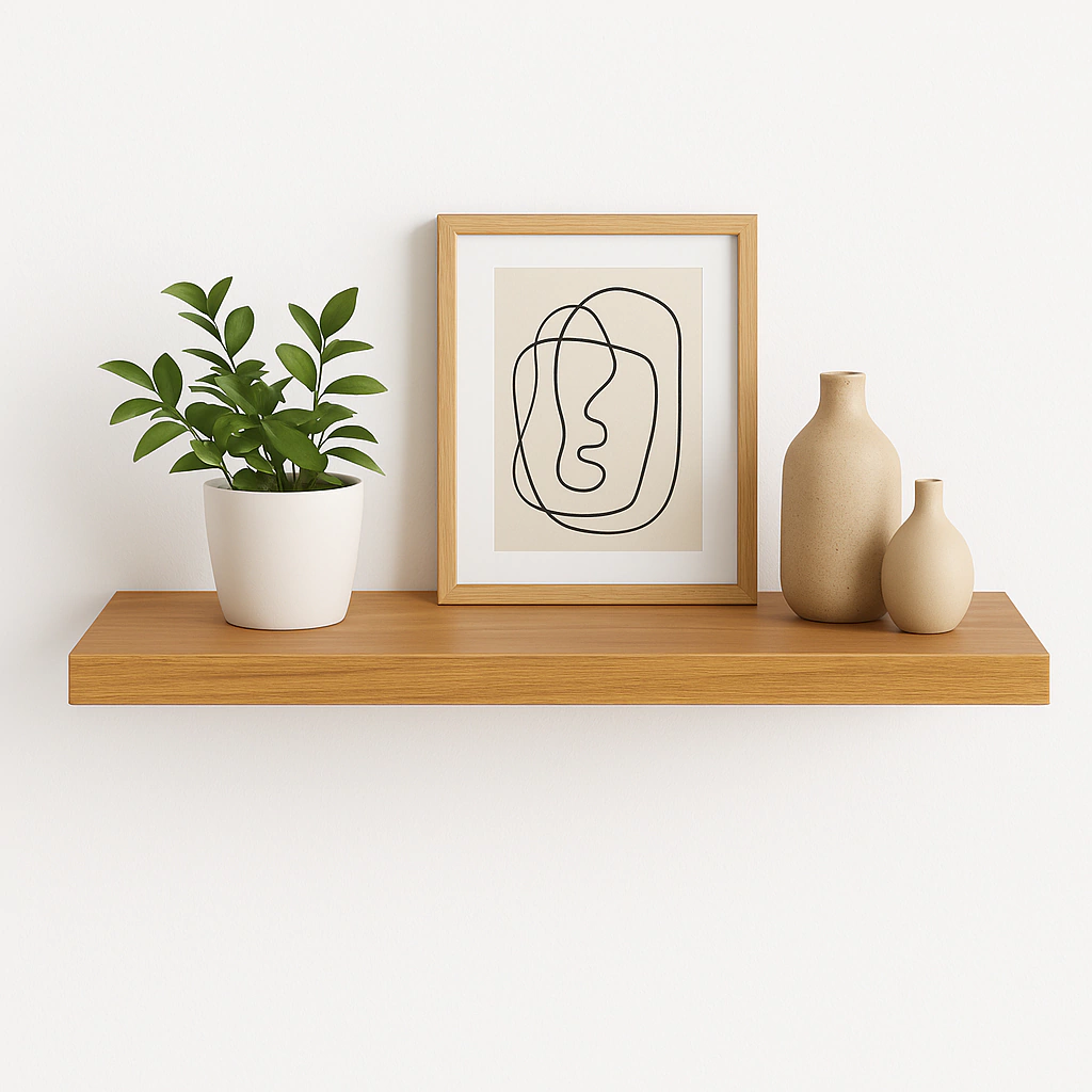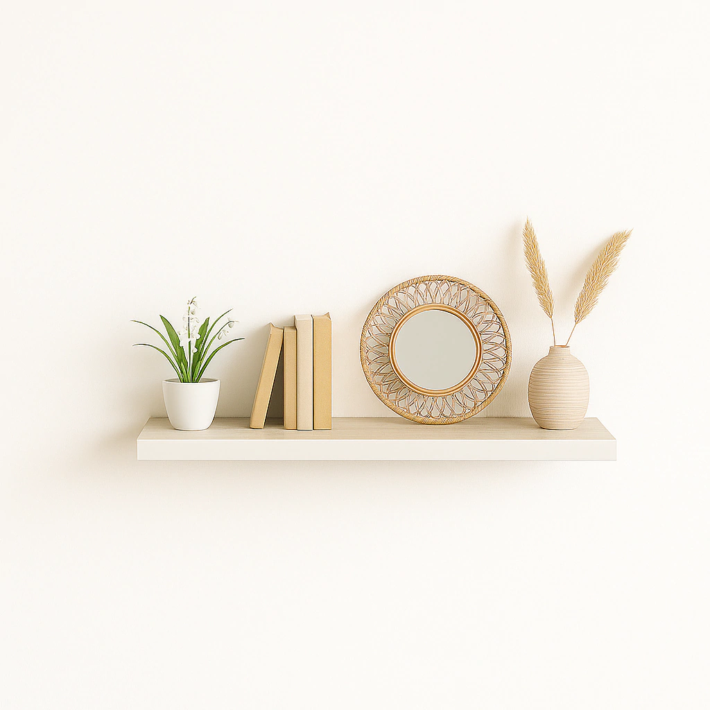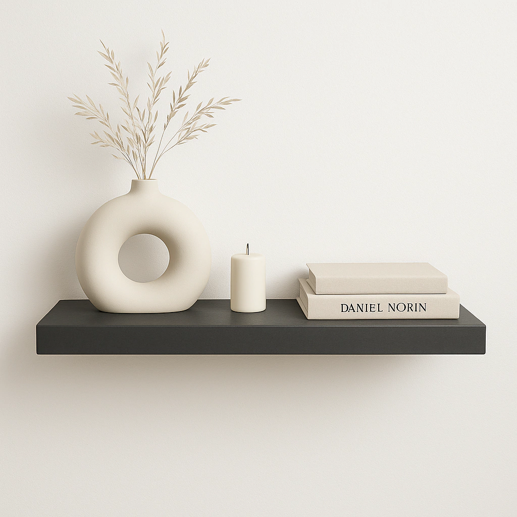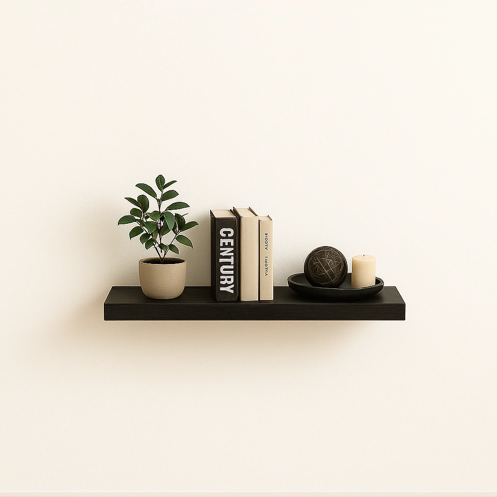 Fabricado con materiales resistentes, es ideal para libros, marcos, plantas pequeñas o artículos decorativos. Su diseño flotante permite una instalación limpia y sin soportes a la vista, optimizando el espacio con estilo.