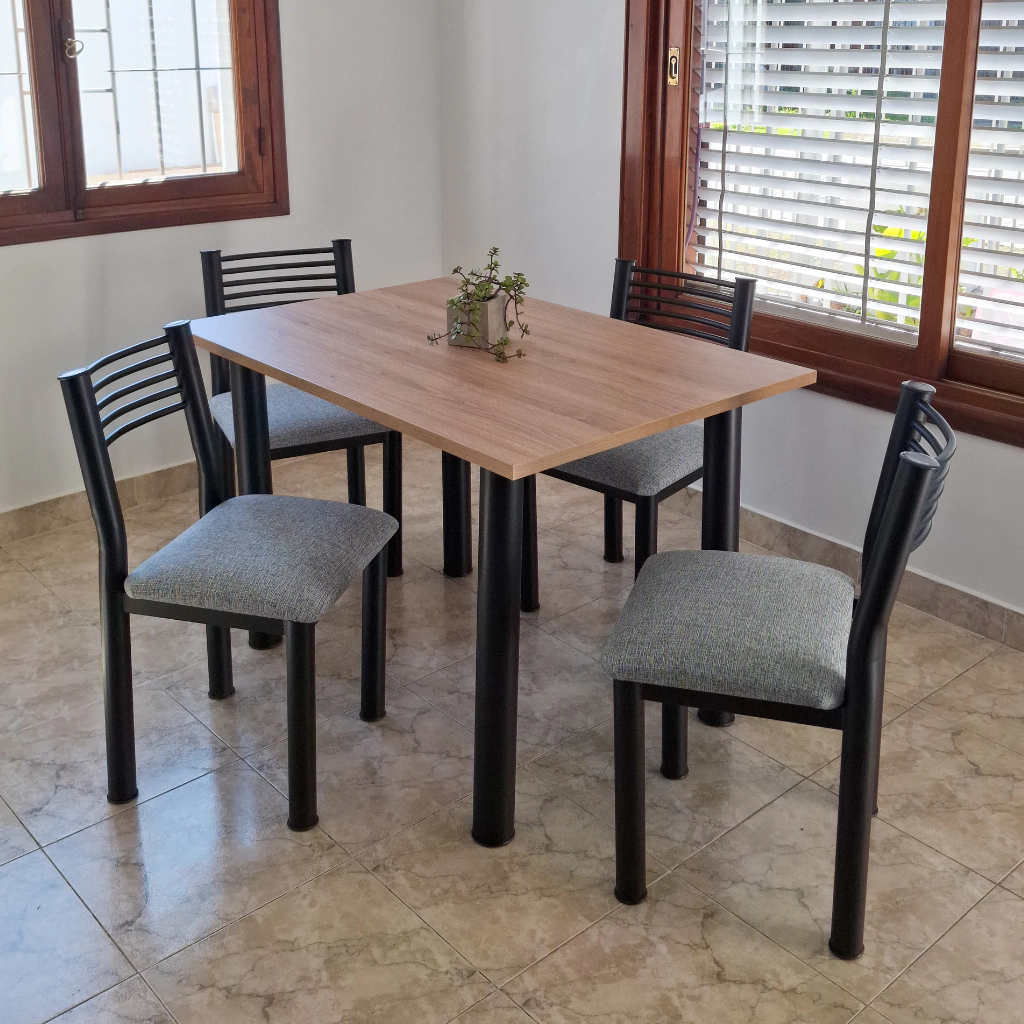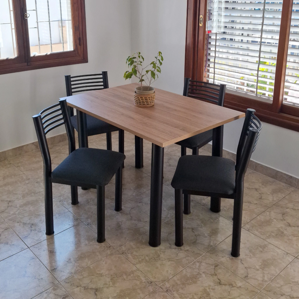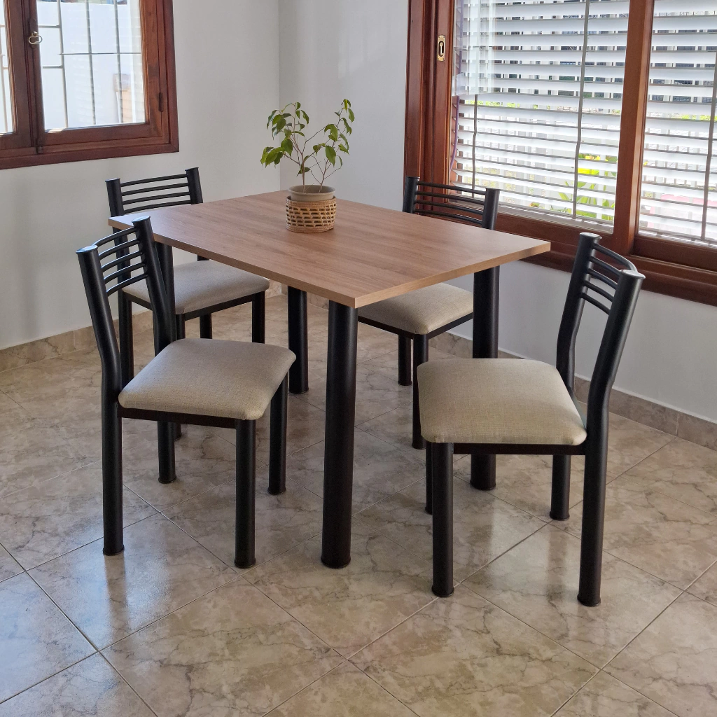 Renová tu comedor con este juego de comedor que combina estilo, resistencia y confort. La mesa está diseñada con estructura de hierro industrial pintada en epoxi negro mate, garantizando durabilidad y un acabado de alta calidad. Su tapa de melamina en color olmo finlandés de 1200 mm de largo le aporta calidez y un toque sofisticado, perfecta para cenas en familia o reuniones con amigos. Las patas de 3" le otorgan firmeza y presencia.