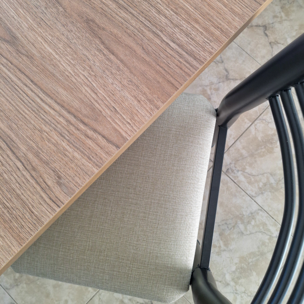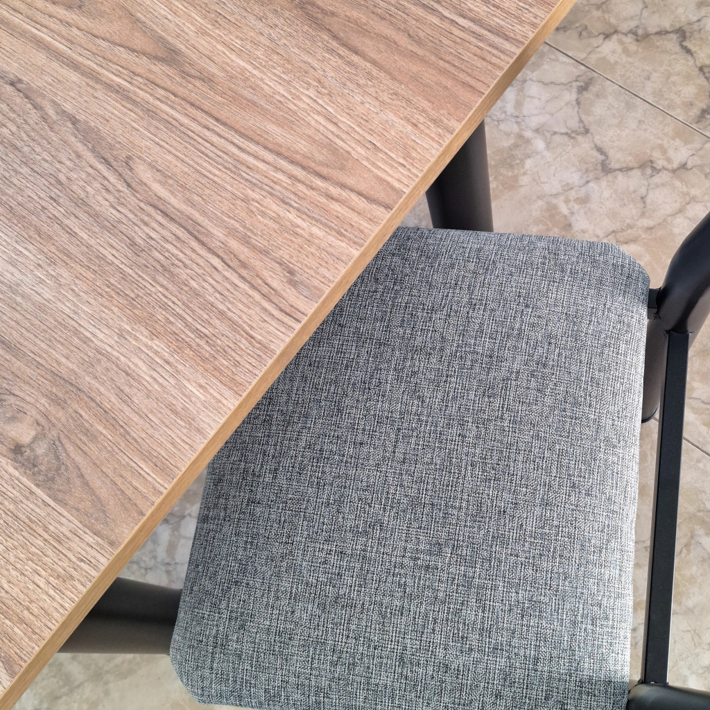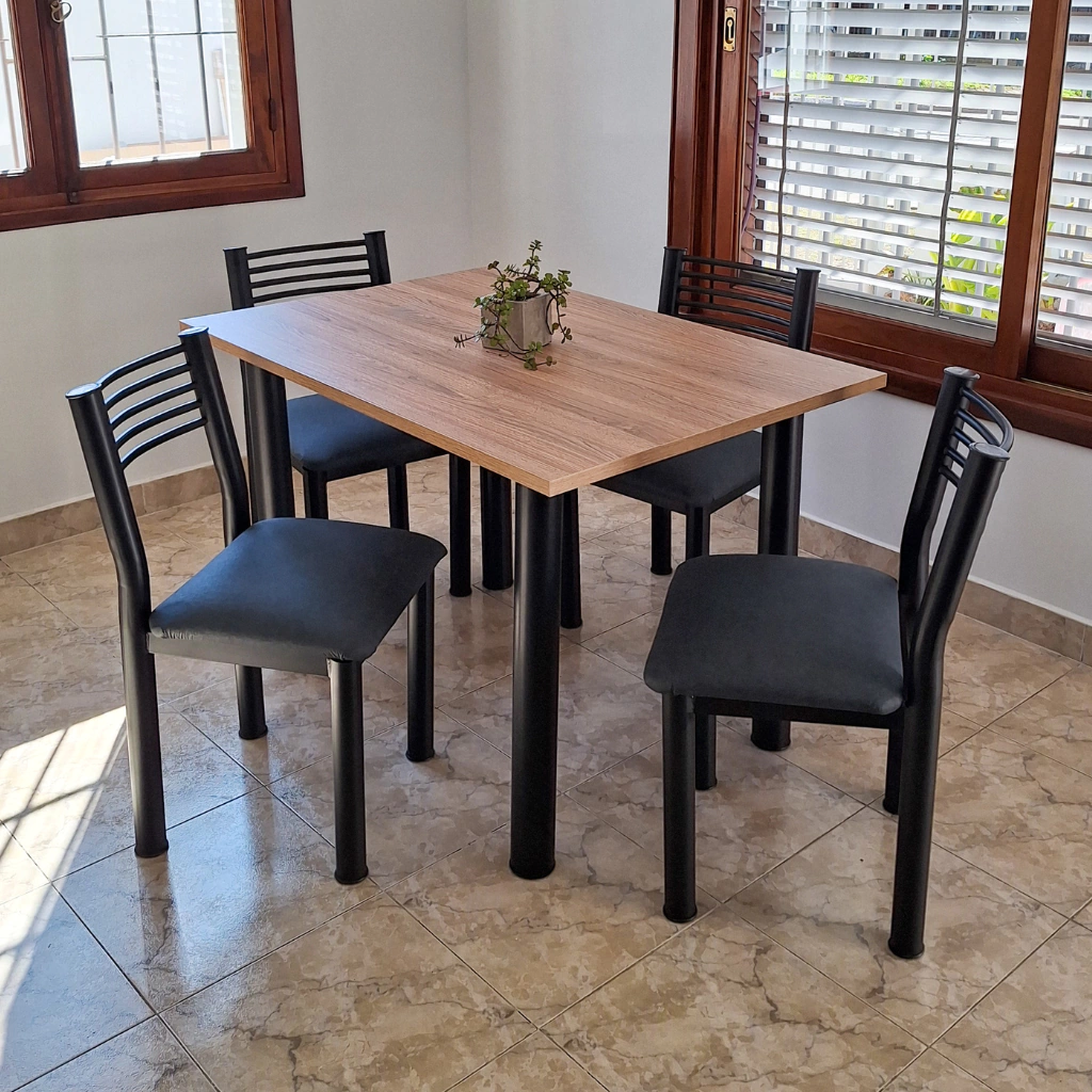 Renová tu comedor con este juego de comedor que combina estilo, resistencia y confort. La mesa está diseñada con estructura de hierro industrial pintada en epoxi negro mate, garantizando durabilidad y un acabado de alta calidad. Su tapa de melamina en color olmo finlandés de 1200 mm de largo le aporta calidez y un toque sofisticado, perfecta para cenas en familia o reuniones con amigos. Las patas de 3" le otorgan firmeza y presencia.