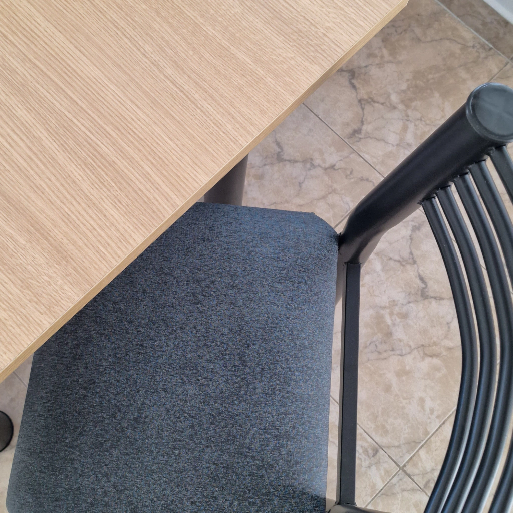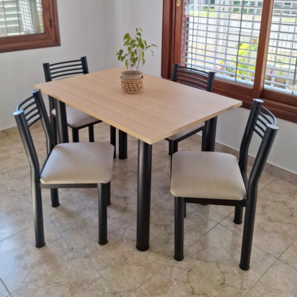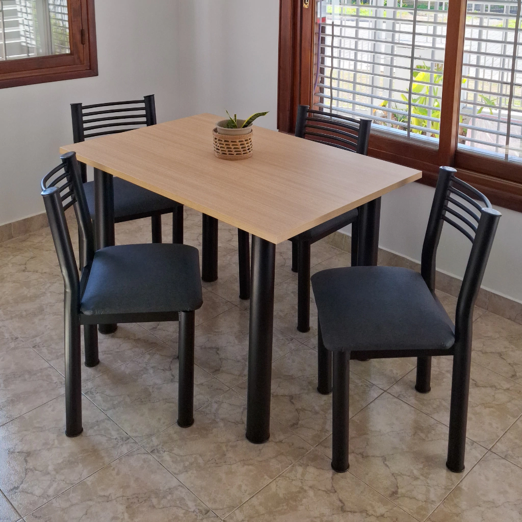 Acompañan este conjunto 4 sillas Josefina, fabricadas con estructura metálica reforzada. Su diseño moderno con respaldo curvo y varillas horizontales asegura comodidad ergonómica.