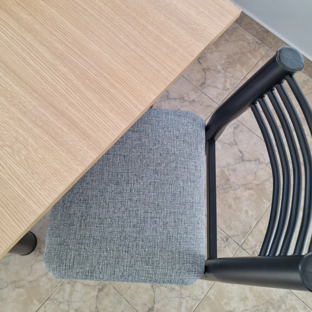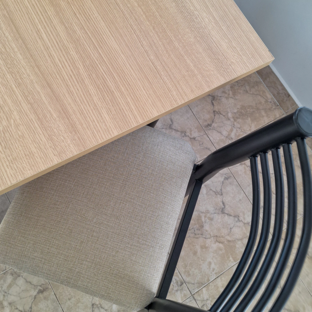 Renová tu comedor con este juego de comedor que combina estilo, resistencia y confort. La mesa está diseñada con estructura de hierro industrial pintada en epoxi negro mate, garantizando durabilidad y un acabado de alta calidad. Su tapa de melamina en color roble americano de 1200 mm de largo le aporta calidez y un toque sofisticado, perfecta para cenas en familia o reuniones con amigos. Las patas de 3" le otorgan firmeza y presencia.