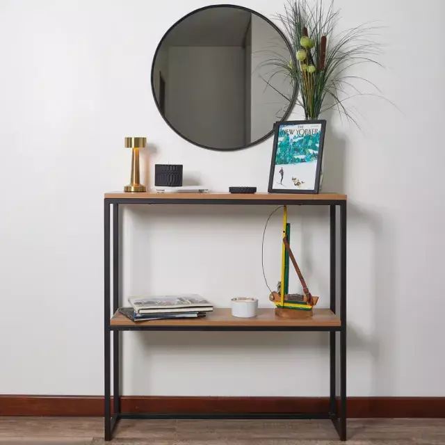 Con Estructura de Hierro Industrial pintada con pintura epoxi en negro mate de alta calidad y duracion, este producto es ideal para colocarlo en tu living, como recibidor, o inclusive en tu pasillo, ya que su medida en profundidad es ideal para lugares con poco espacio. Además, cuenta con una tapa de melamina color olmo finlandés el cual también permite dejar tus objetos a mano.