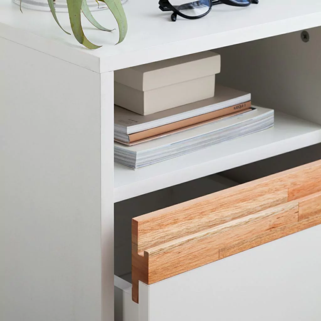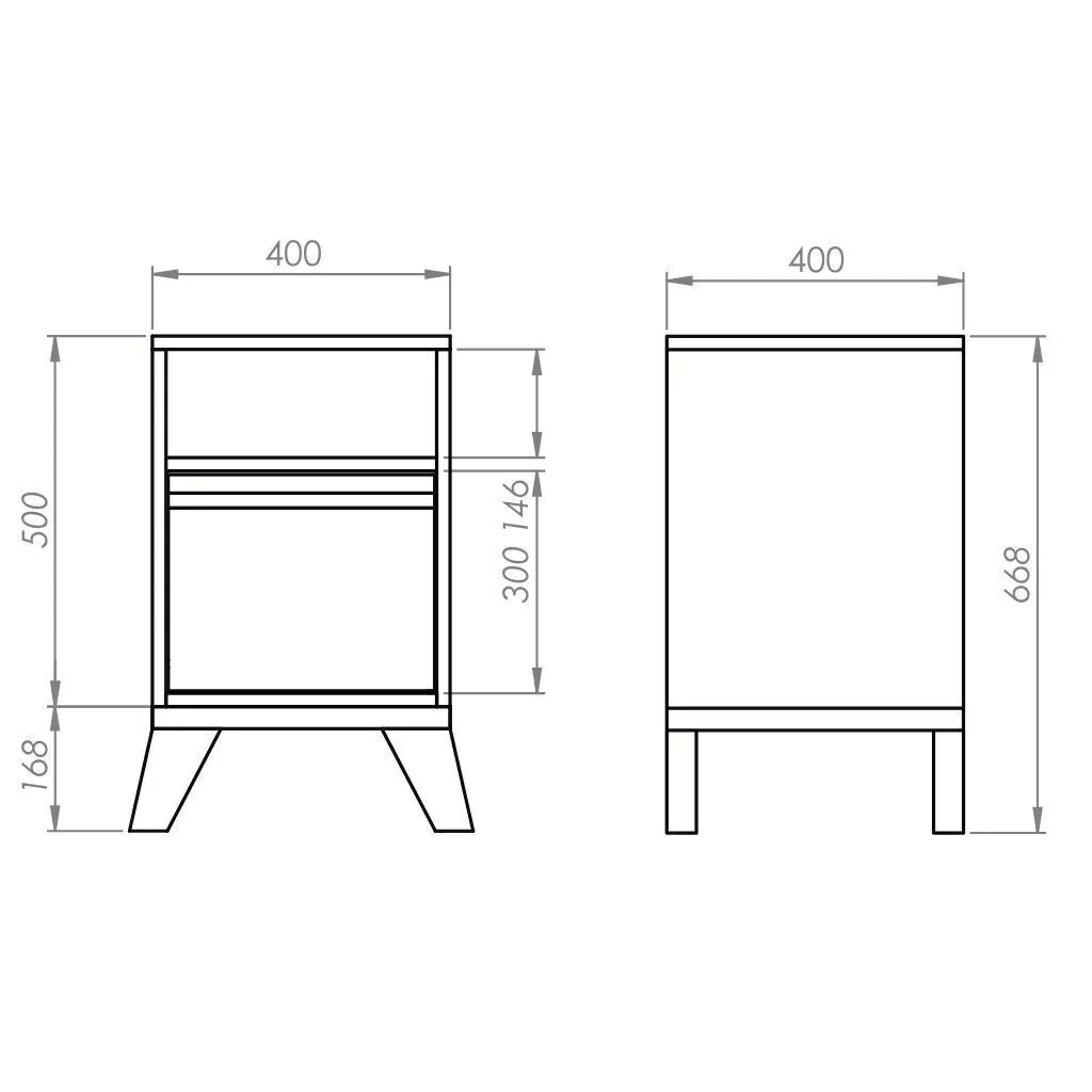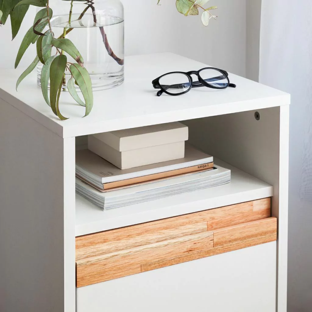 Esta mesa de luz está hecha de melamina y tiene un cajón con guías telescópicas, cuyas patas, base y perfil son de eucalipto laqueado. Además, tiene un espacio abierto de 364x146x382 mm.