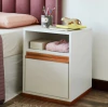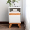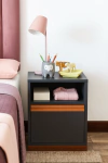Esta mesa de luz está hecha de melamina y tiene un cajón con guías telescópicas, cuyas patas, base y perfil son de eucalipto laqueado. Además, tiene un espacio abierto de 364x146x382 mm.