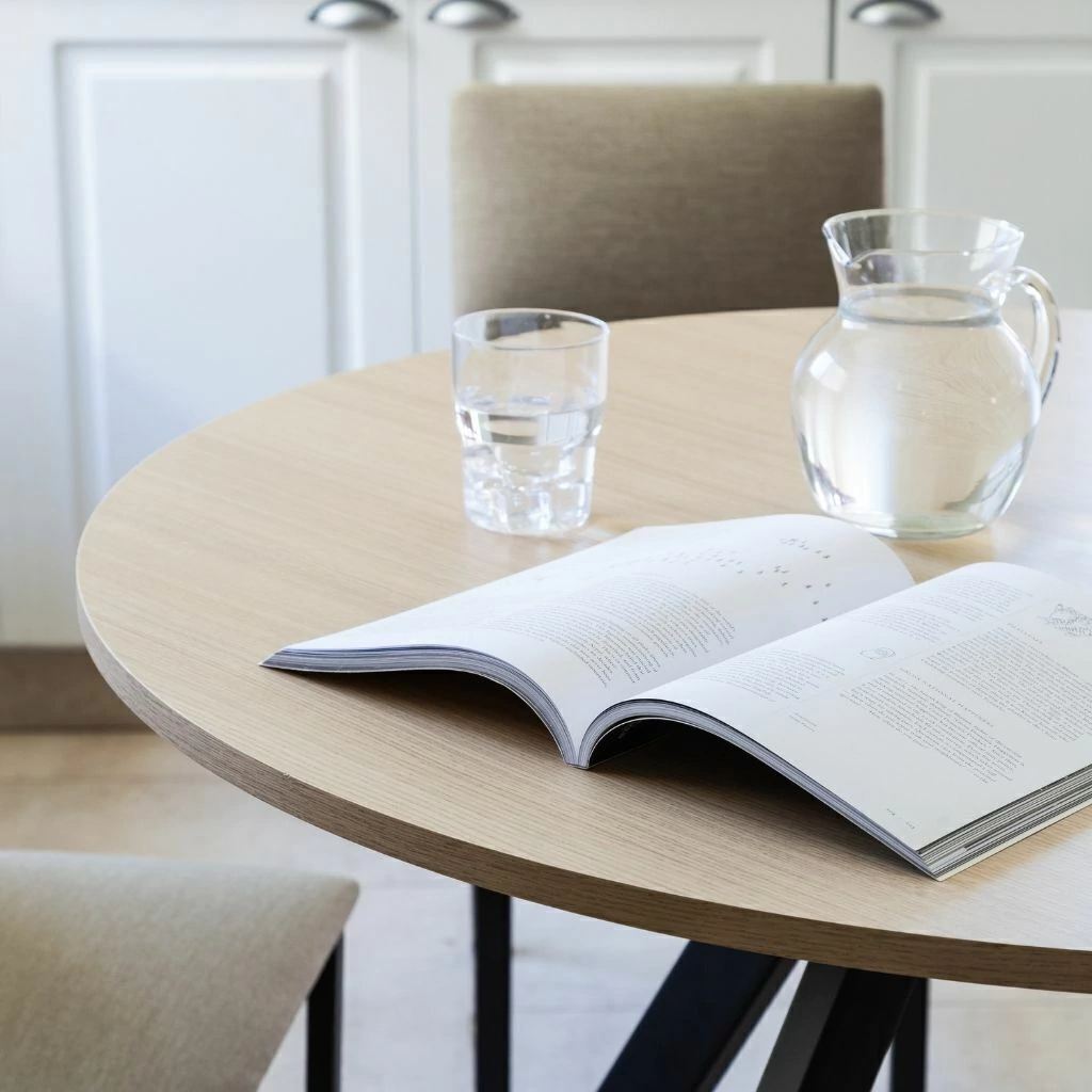 Con una estructura de hierro industrial de 60x30 en blanco o negro mate, esta mesa redonda se destaca por su estilo minimalista, ideal para comedores, oficinas o espacios de trabajo. Además, su tapa puede ser en color olmo finlandés o roble americano, colores ideales para cualquier tipo de estilo.