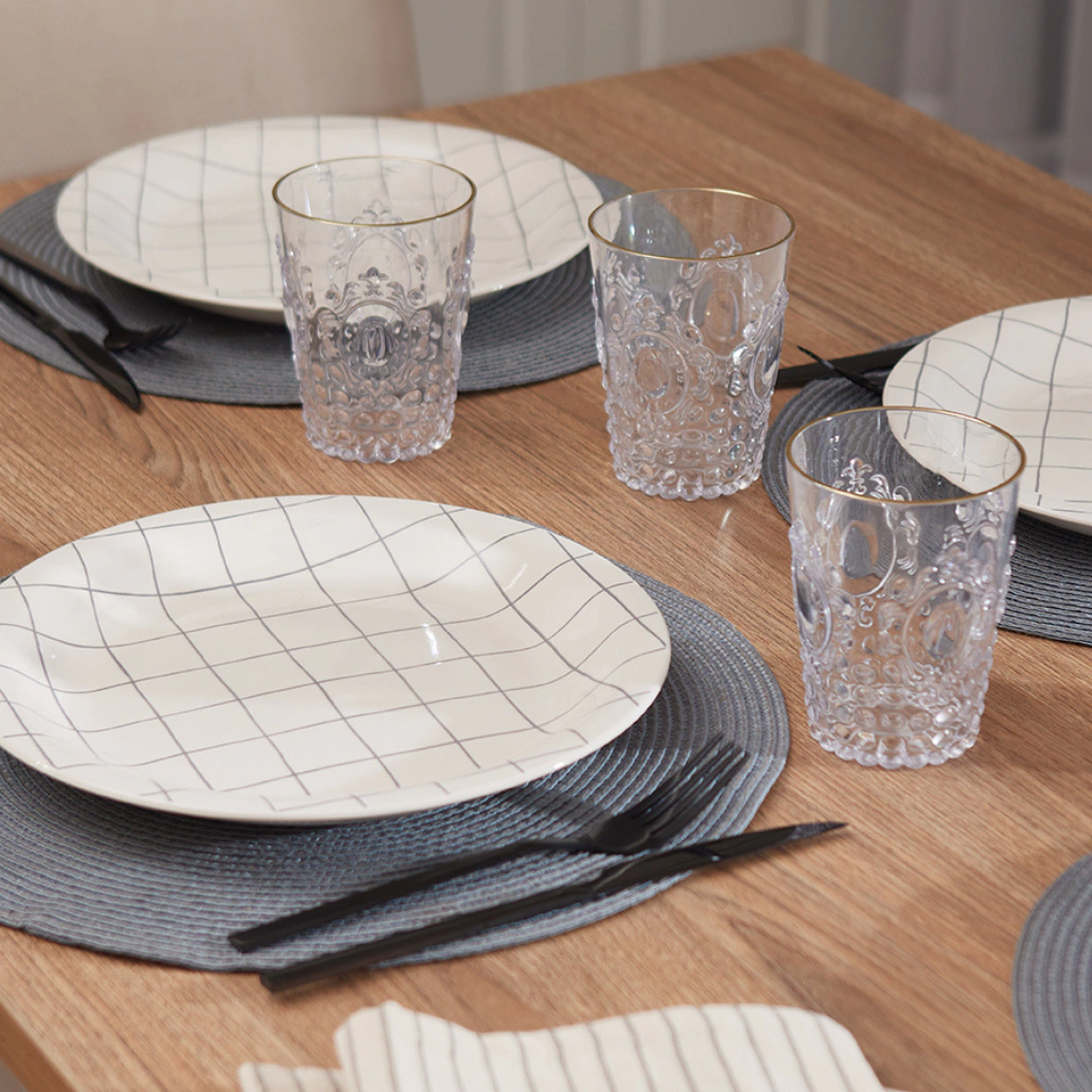 Gracias a su estampa de estilo artesanal, puede hacer juego con otra vajilla lisa en tonos neutros, copas cristalinas y con cubiertos negros o plateados.