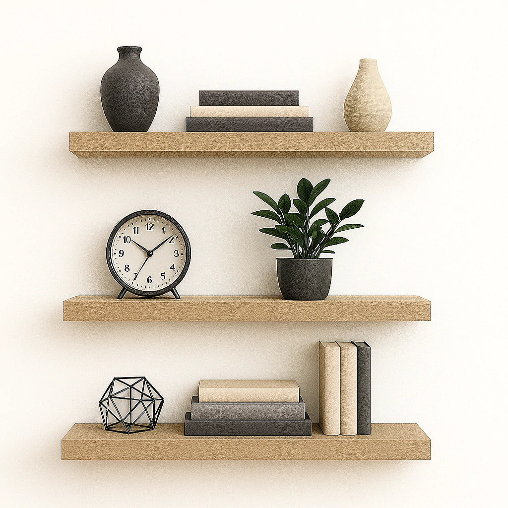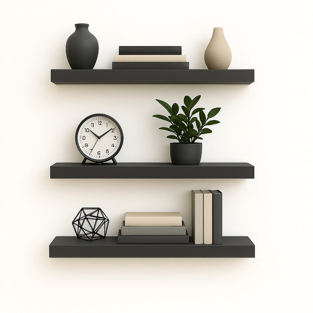 Maximizá el espacio con estilo y funcionalidad con este set de 3 estantes flotantes. Ideales para exhibir libros, cuadros, plantas o elementos decorativos, estos estantes ofrecen una solución práctica y estética para organizar ambientes reducidos o destacar paredes vacías. Su sistema de fijación oculta brinda una instalación limpia, segura y sin soportes a la vista.